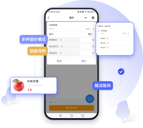 新增商品、调价、建促销活动、采购、配送、批发、盘点、传秤、打标签等高频门店业务,无需登录后台,手机小程序一站式解决。